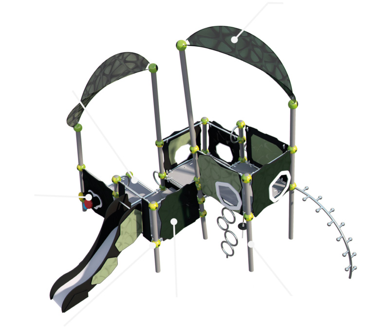 LevelUp.01.1 bietet eine Vielzahl an Anbauelementen wie Kletterringe, Balancierkugeln, ein Kletternetz und eine Fast Lane Slide.