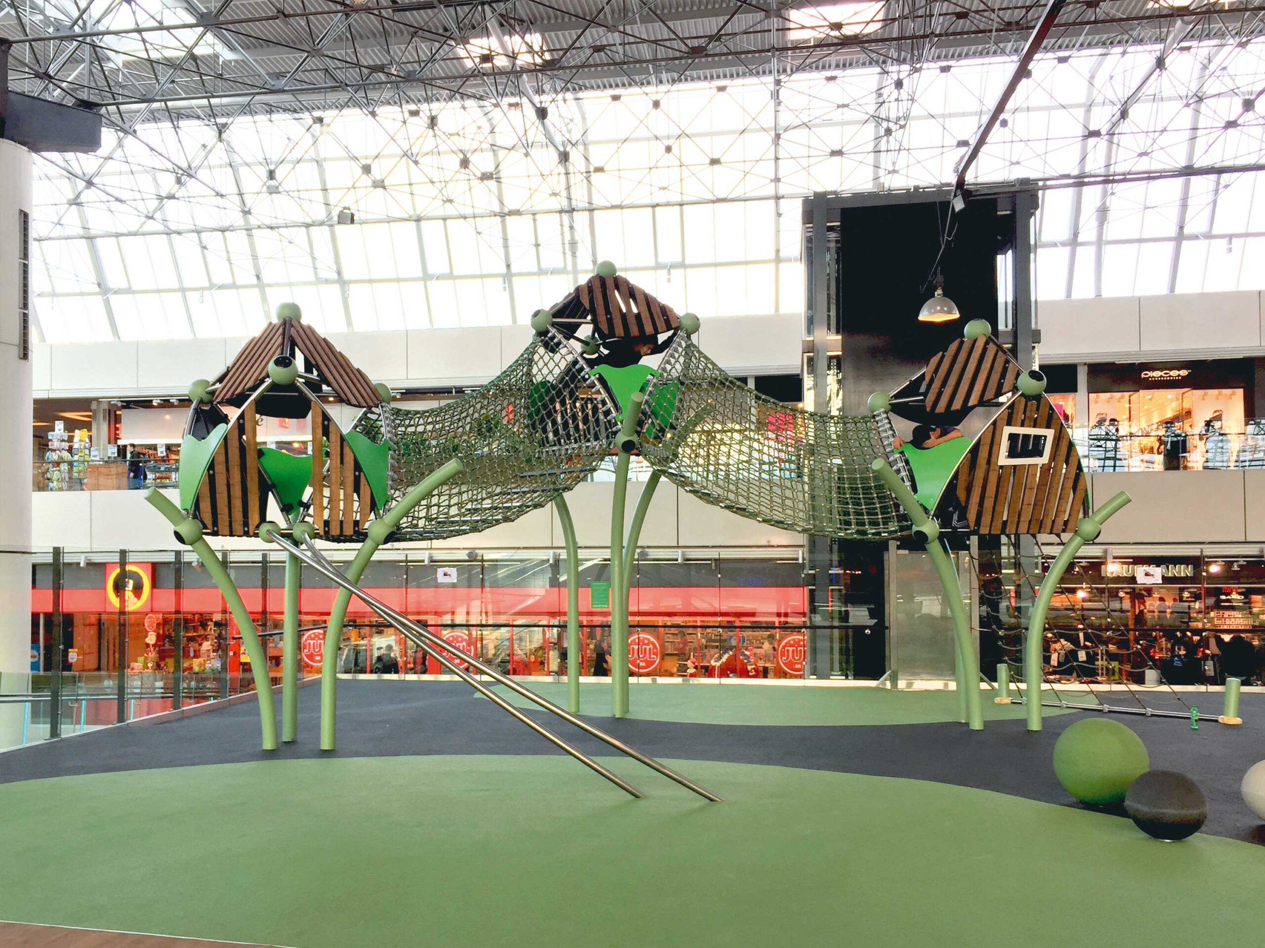 A Trii3 and two Trii2 ’s connected by two tunnels. One Trii2 has an access net and the other a curved banister.
