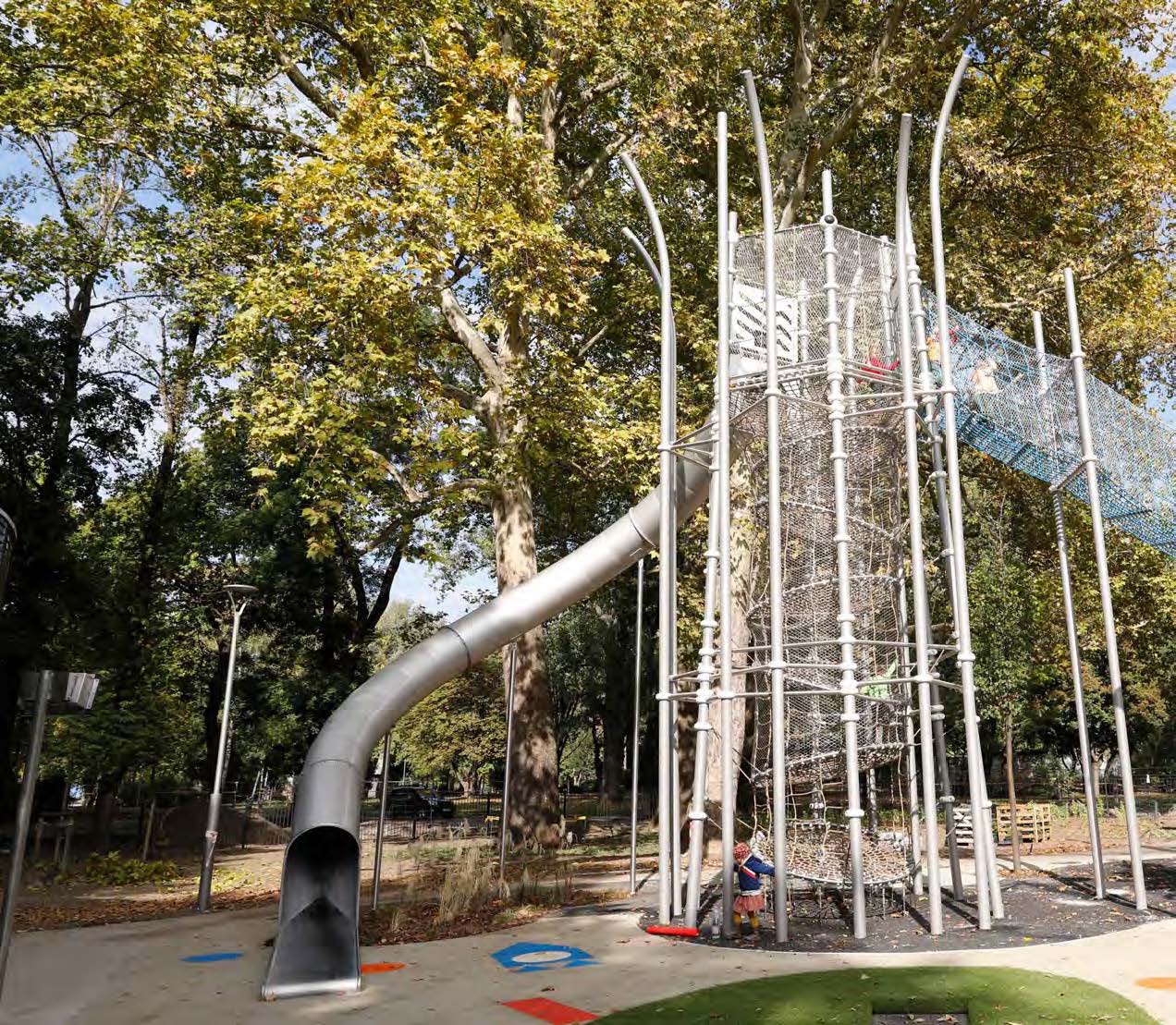 What looks confusing from the outside is structured on the inside. Level after level must be climbed to reach the top of this mystical tower. “Descent” is via the pre- cipitous tunnel slide that winds half way around the tower. The tower is enclosed by safety netting that is virtually transpar- ent, granting children maximum safety while accompanying adults are able to see clearly what’s happening inside.